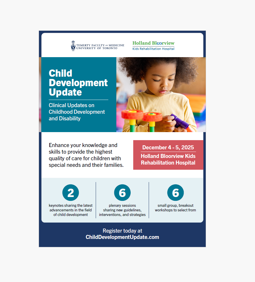 Enhance your knowledge and skills to provide the highest quality of care for children with special needs and their families at this two-day conference. Keynote presentations on precision health and the evolving genetics of cerebral palsy delivered by Dr. Evdokia Anagnostou and Dr. Darcy Fehlings. Plenary sessions covering ADHD, Rett Syndrome, feeding and sleep disorders, and more. Workshops exploring ARFID, spasticity management, and early CP diagnosis.