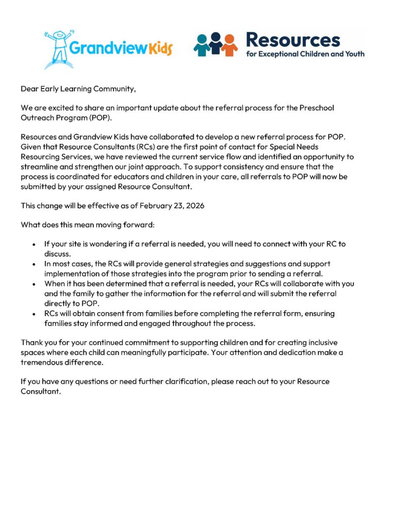 Back to All News Posts Preschool Outreach Program (POP) Referral Update Child Care Centres and Providers Share